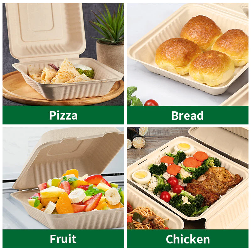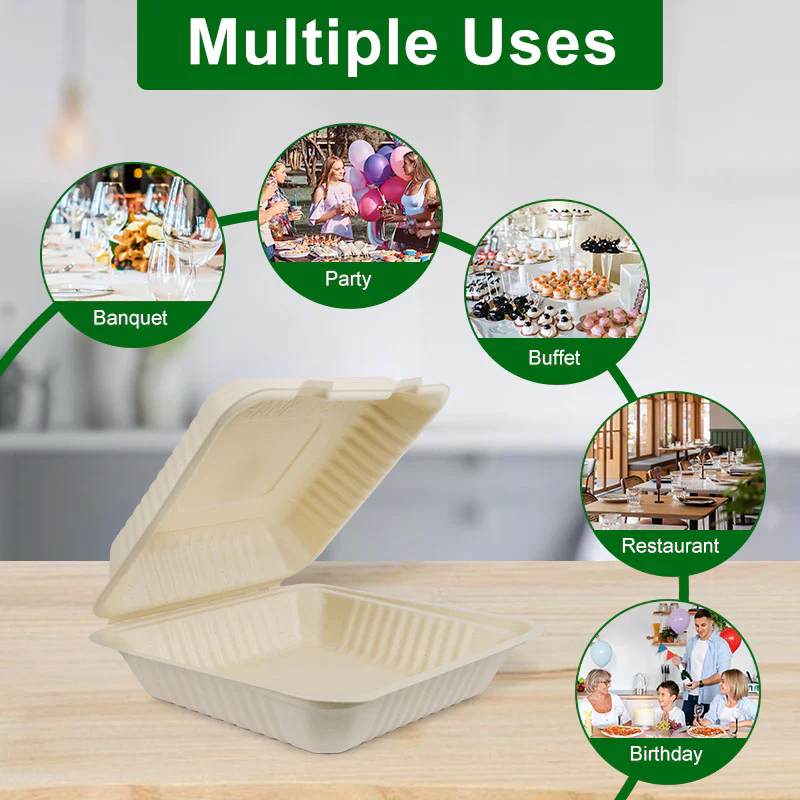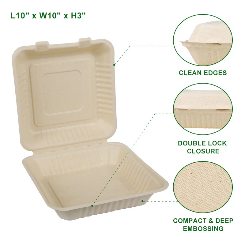 Great to serve meals in a convenient style in our 10″x10″x3″ Compostable Clamshell Containers. These compostable fiber containers are eco-friendly, they are made of sugarcane/bagasse, biodegradable, and compostable. Perfectly for a sandwich, burger, fries, side salad, tacos, fried chicken, rice, and meat to your liking. Widely used for restaurants, to-go orders, deliveries, special events, and any type of food service environment.